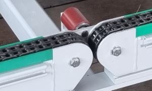 Der Kettenstrang in schmaler Ausführung sieht im Schnitt wie dargestellt aus. Die Achse der Umlenk-Kettenräder wird beidseitig mit Senkschrauben befestigt.