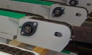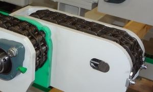 Abhängig von den Kufen des Förderguts können die Kettenstränge der Kettenförderer kammförmig versetzt zueinander angeordnet werden, um eine reibungslose Übergabe des Förderguts von einem Förderer zum nächsten zu gewährleisten.